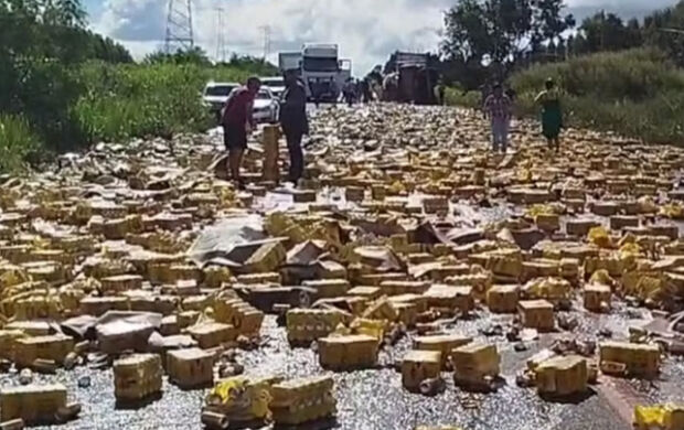 Carreta tomba e carga de cerveja fica espalhada pela pista em MS