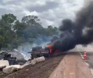 Vídeo mostra a fumaça preta e chamas intensas saindo do veículo. A carga de algodão toma parte das margens da pista. Ainda não há informações sobre as circunstâncias do acidente e se alguém ficou ferido.