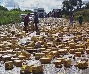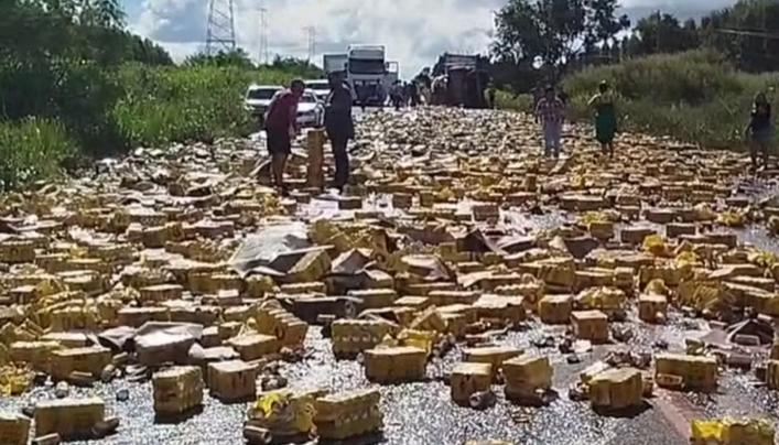 Imagens feitas no local mostram a carga de cerveja completamente espalhada pela pista, ocupando parte da rodovia e chamando a atenção de motoristas que passavam pelo trecho.