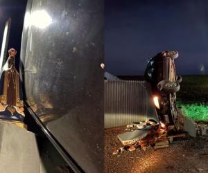 Uma vereadora de Formosa do Oeste, no oeste do Paraná, saiu ilesa após sofrer um acidente na madrugada de sábado (6). O carro que ela dirigia capotou e parou apoiado aos pés de uma imagem de Nossa Senhora Aparecida, instalada às margens da rodovia.