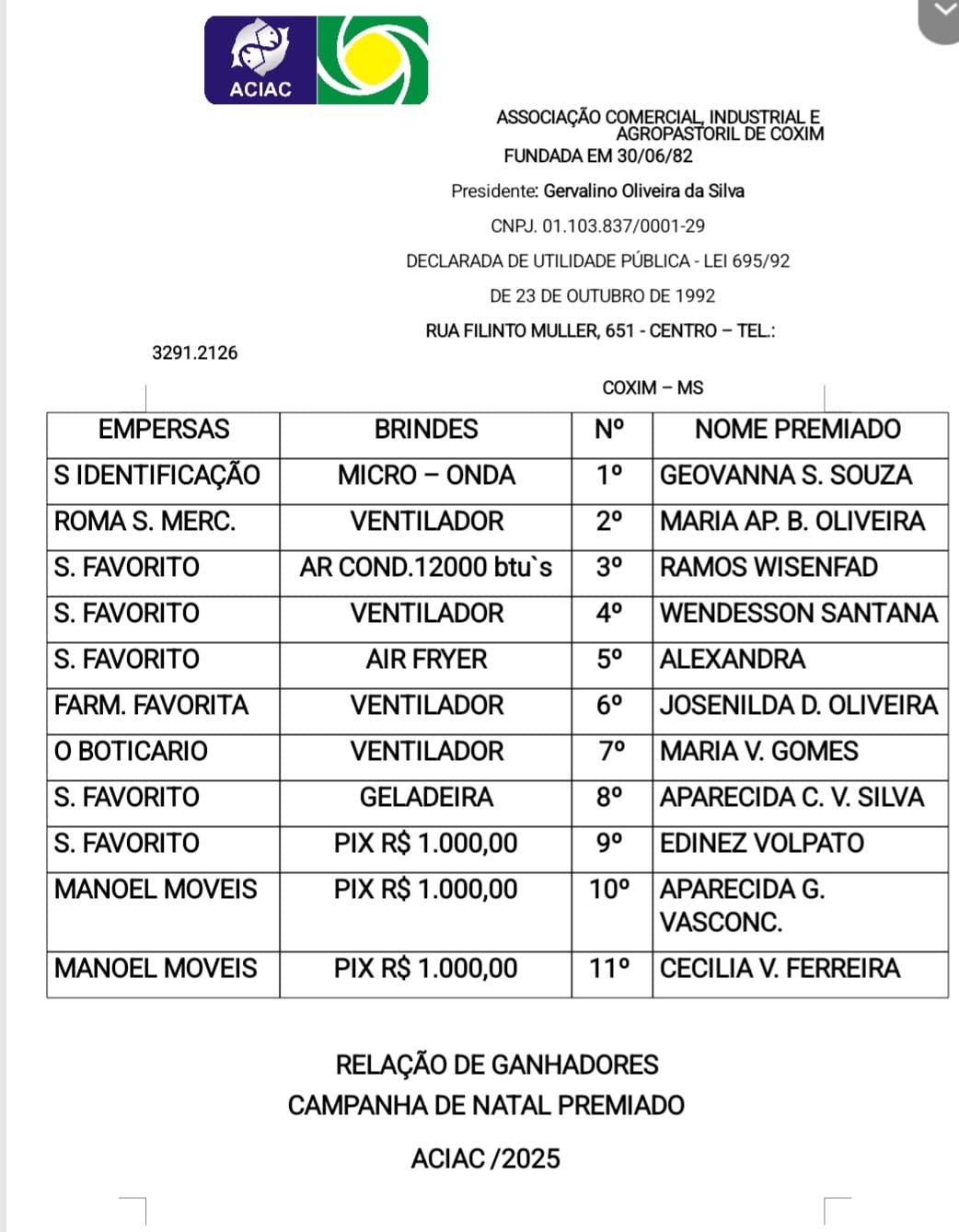 O presidente da Associação Comercial, Industrial e Agropastoril de Coxim (ACIAC), Gervalino Oliveira da Rocha, fez um agradecimento especial às empresas participantes da campanha Natal Premiado 2025, à diretoria da entidade e aos consumidores que prestigiaram o comércio local.