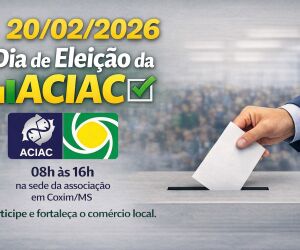 A Associação Comercial, Industrial e Agropastoril de Coxim (ACIAC) realiza nesta sexta-feira, 20 de fevereiro, a eleição para a composição da Diretoria e dos Conselhos que estarão à frente da entidade no biênio 2026/2028.