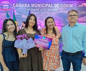 Durante a solenidade, a parlamentar concedeu Moção de Congratulação à comerciante e educadora Eliane Lopes de Souza Landim, em reconhecimento à sua história de superação, dedicação e contribuição à sociedade coxinense.