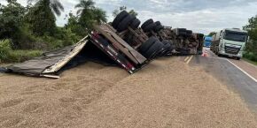 Motorista desvia de caminhonete e tomba carreta na BR-163 entre Coxim e Pedro Gomes