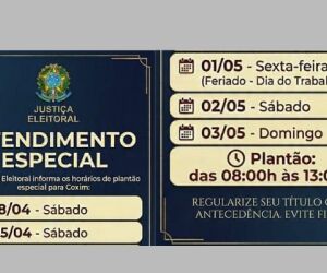 O cartório eleitoral de Coxim definiu um calendário especial de atendimento para os eleitores da cidade e região com plantões em datas estratégicas que visam facilitar o acesso da população aos serviços eleitorais e evitar a tradicional correria de última hora.