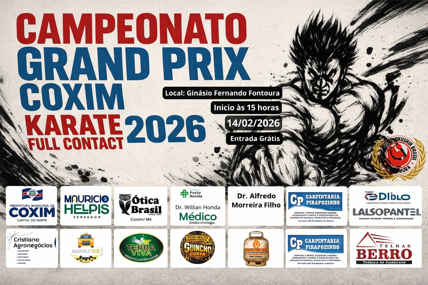 Coxim será palco de um grande evento esportivo neste sábado, 14 de fevereiro de 2026, a partir das 15 horas, com a realização do Grand Prix Karatê Full Contact, que reunirá atletas de diversas cidades e estados do Brasil.
