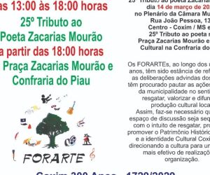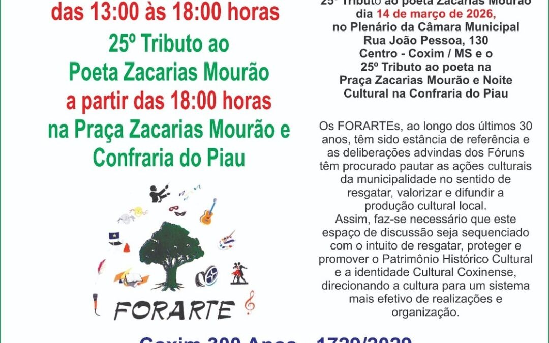 A cultura, a identidade e o futuro cultural de Coxim estarão em pauta no sábado (14) com a realização do Forarte – Fórum de Arte e Cultura de Coxim. O evento, considerado um dos mais importantes espaços de debate cultural do município, será realizado a partir das 13 horas no plenário da Câmara Municipal de Coxim e deve reunir artistas, escritores, produtores culturais, autoridades e membros da comunidade.