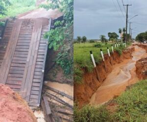 Em Coxim, 7 bairros foram atingidos, 4 pontes e 9 vias públicas danificadas. Um das imagens que chamou a atenção foi uma rua que não aguentou a força da água e abriu uma enorme erosão.