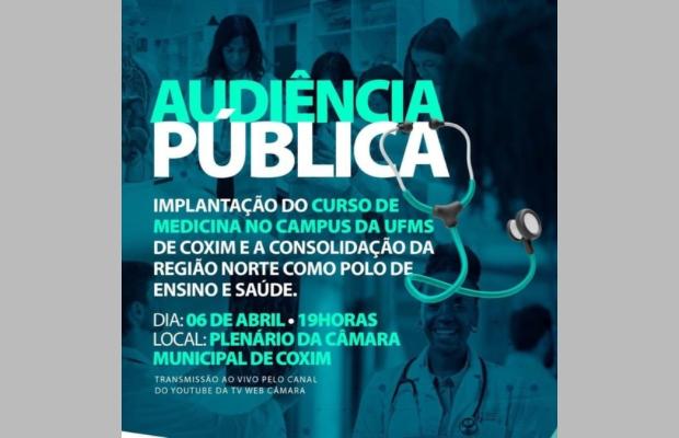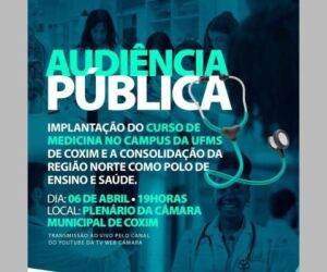 A Prefeitura Municipal e a Câmara Municipal de Coxim realizarão uma audiência pública para discutir a implantação do curso de Medicina no Campus da Universidade Federal de Mato Grosso do Sul (UFMS) na cidade. O evento, que representa um marco importante para a educação e saúde da região Norte do estado, acontecerá no dia 06 de abril, às 19 horas, no Plenário da Câmara Municipal de Coxim.