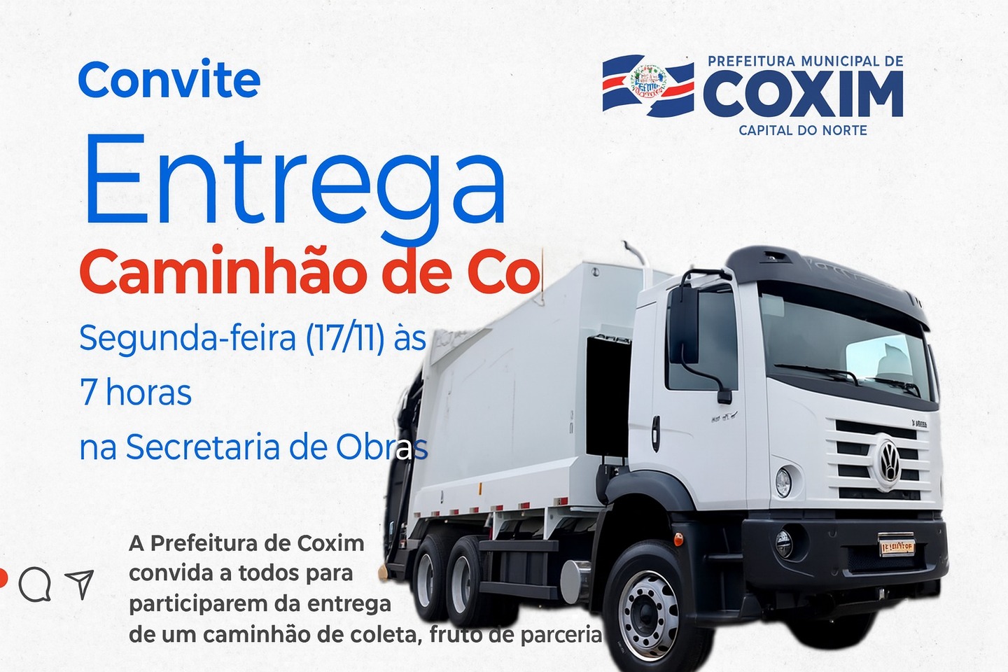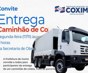 A Prefeitura de Coxim promoverá na próxima segunda-feira (17), às 7h, na Secretaria de Obras, a entrega oficial de um novo caminhão de coleta. A ação, fruto de parceria entre os poderes Executivo, Legislativo e a senadora Tereza Cristina, reforça o compromisso da administração com a modernização dos serviços de limpeza urbana e o cuidado com a cidade.
