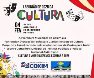 A Prefeitura Municipal de Coxim, em parceria com a Fundação Professora Clarice Rondon de Cultura, Desporto e Lazer (FUNRONDON), realizará no próximo dia 4 de fevereiro a 1ª Reunião de 2026 da Cultura. O encontro está marcado para às 19h, no Auditório José Guedes de Melo.