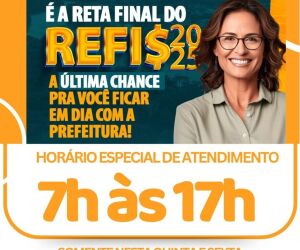 A Prefeitura de Coxim informa que quinta e sexta-feira serão os últimos dias para adesão ao Programa de Recuperação Fiscal (Refis 2025). Para facilitar o atendimento, a Gerência de Tributos atenderá em horário especial, das 7h às 17h, sem interrupção.