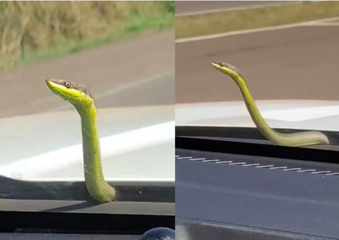 "A gente estava olhando pra estrada e, de repente, ela apareceu com a cabeça. Aí fomos indo, né? Ela entrou de novo no motor e continuou a viagem. Depois a gente parou, e o colega tirou ela com um galho e levou de volta pra mata", contou o enfermeiro.