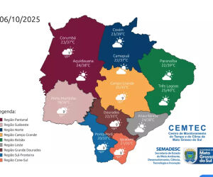Contudo, estão previstas para esta segunda-feira as mínimas entre 20 e 22°C e máximas entre 33 e 35°C para a região sul, cone-sul e grande Dourados. Nas regiões pantaneira e sudoeste, as mínimas devem variar entre 19 e 24°C e máxima entre 36 e 38°C. Já nas regiões do bolsão, leste e norte os termômetros devem registrar mínimas entre 22 e 25°C e máximas entre 37 e 40°C.