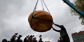 Abóbora gigante de quase 1 tonelada é erguida por guindaste em festival