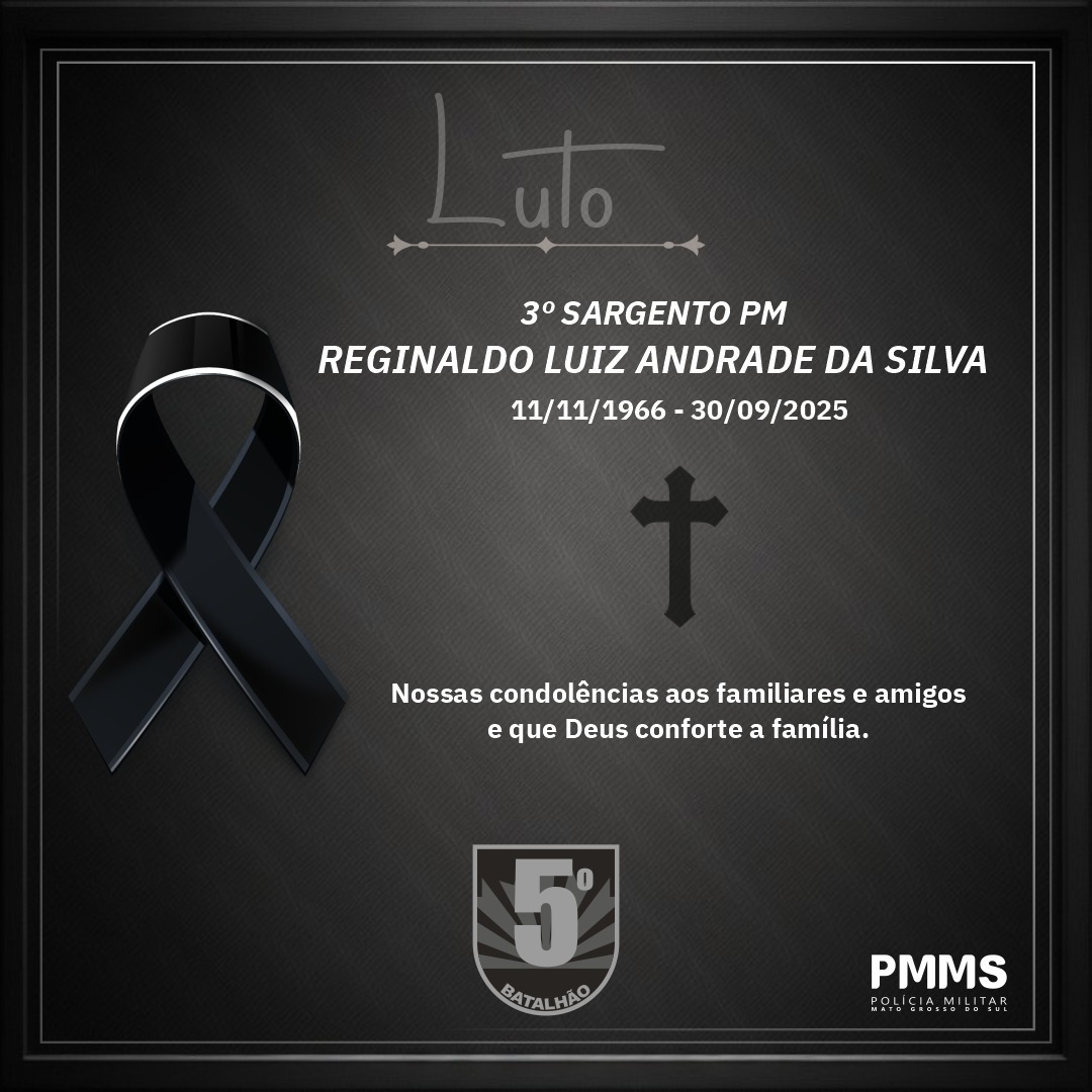 A Polícia Militar do Estado de Mato Grosso do Sul lamenta profundamente o falecimento do 3º Sargento PM Reginaldo Luiz Andrade da Silva, integrante do 5º Batalhão de Polícia Militar de Coxim/ MS.