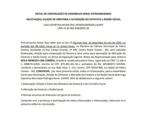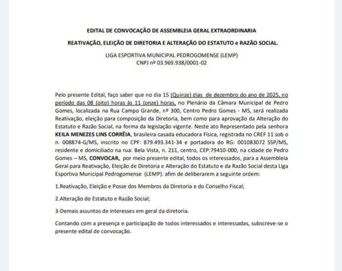 Pelo presente Edital, faço saber que no dia 15 (quinze) de dezembro do ano de 2025, no período das 08 (oito) horas às 11 (onze) horas, no Plenário da Câmara Municipal de Pedro Gomes, localizada na Rua Campo Grande, nº 300, Centro Pedro Gomes - MS,será realizada a reativação e eleição para composição da Diretoria, bem como para aprovação da Alteração do Estatuto e Razão Social, na forma da legislação vigente. Neste ato representado pela senhora KEILA MENEZES LINS CORRÊIA, brasileira casada, educadora física, registrada no CREF 11 sob o nº 008874-G/MS,inscrito no CPF: 879.493.341-34 e portadora do RG: 001083072 - SSP/MS, residente e domiciliado na rua: Bela Vista, nº 211, centro, CEP:79410-000, na cidade de Pedro Gomes MS, CONVOCAR, por meio do presente edital, todos os interessados, para a Assembleia Geral para Reativação, Eleição de Diretoria e Alteração do Estatuto e da Razão Social desta Liga Esportiva Municipal Pedrogomense (LEMP).afim de deliberarem a seguinte ordem: