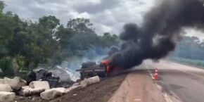 Carreta pega fogo após acidente e chamas altas assustam condutores na BR-163 entre Coxim e Sonora